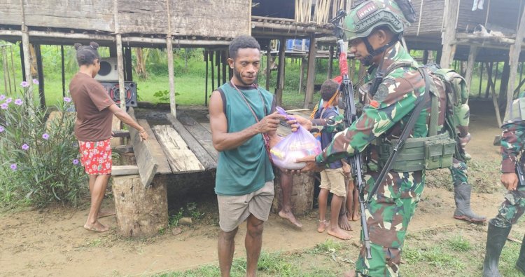 BINTANG - Suasana penuh kehangatan dan kebersamaan terasa di Kampung Belemu, Distrik Batom, Kabupaten Pegunugan Bintang, Papua Pegunungan, saat Satgas Yonif 753/AVT melalui Pos Belemu melaksanakan kegiatan anjangsana dengan membagikan bantuan sosial kepada masyarakat, Minggu (19/4/2026).